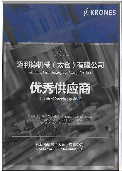 獲得克朗斯機械(太倉)有限公司2013年度優秀供應商稱號